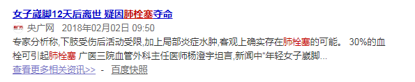 肺栓塞是一种凶险的急症!发生肺栓塞症后,患者会突然倒地,严重的情况可能会导致死亡。有数据显示,未经治疗的肺栓塞死亡率大约30%,但经过充分治疗后,病死率可降至2%—8%,为此我们需要早期发现肺栓塞的存在,一旦有此类气血不通,及时处理,即可获得良好疗效,挽救生命。