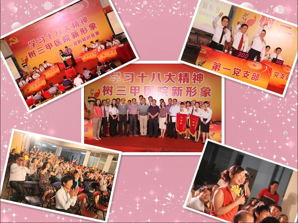 为深入贯彻落实党的十八大精神,纪念中国共产党成立92周年,进一步加强我院学习型、服务型、创新型党组织建设,强化党员对十八大精神、党章的认识和理解并转化为推动医院中心工作的强大精神动力和提供组织保障,6月14日晚,我院党总支在医院东部院区澄溪楼一楼举行了主题为“学习十八大精神 树三甲医院新形象”党的知识竞赛活动,来自医院党总支下属四个党支部的9名参赛代表参加了比赛, 200多名党员观看了比赛。