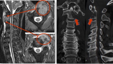家人看他如此痛苦,于是带他到番禺区中医院住院治疗。经检查结合影像学报告,考虑为肝内胆管细胞癌伴寰枢椎骨转移。寰枢关节是高位脊髓及生命中枢所在处,肿瘤的位置决定着该手术的难度很高。“患者颈痛,走路不稳,是寰枢椎破坏导致的颈椎不稳和脊髓受压所致。” 脊柱外科大主任蔡东岭主任表示,影像学检查发现肿瘤破坏了颈2椎体的一半,开始向椎管内生长,如果不及时治疗,病情继续发展将导致手脚单侧或双侧麻木、手脚无力,严重时将导致瘫痪。