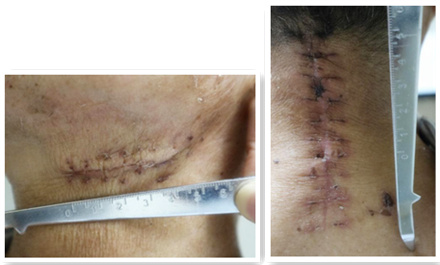 图1:颈部前方切口仅约5cm 图2:颈部后方切口约8cm