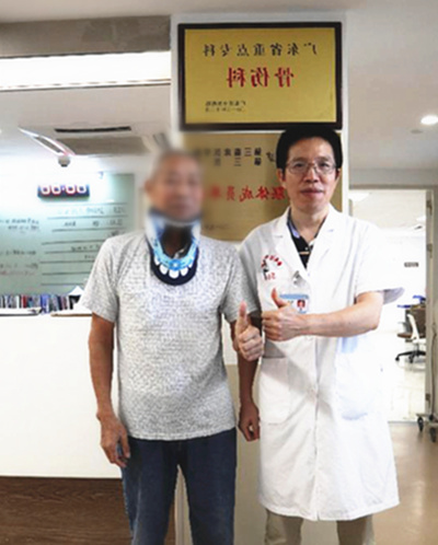 术后,郭先生在ICU观察治疗了两天便转回普通病房,各项生命体征平稳。术后4天,郭先生已经能训练站立和行走,颈痛症状明显缓解,他的脸上也开始有了笑容,术后15天,郭先生高高兴兴地出院了。