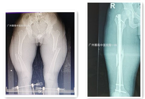 “患者双侧股骨干粉碎性骨折,属于高能量损伤,需要及时手术治疗。”骨伤一科副主任、主任医师冯灿林表示,如果采用传统的钢板内固定术,切口长,手术时间长,出血多,感染风险大,而且偏心固定,固定不坚强,不能早期下地步行功能锻炼,容易引起钢板断裂,膝关节僵硬等严重并发症。如果采用股骨干带锁髓内钉微创接骨术治疗,切口小,手术时间短,出血少,感染风险小,而且髓心固定,固定坚强,能早期下地步行功能锻炼,不容易引起内固定断裂,能早期活动髋、膝关节,不会引起关节僵硬、肌肉萎缩等严重并发症。