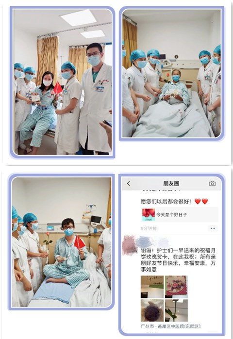 当天早上,骨伤二科的医护人员把寓意团圆、平安的中秋月饼和亲笔书写的慰问卡送到每一位患者手中,送上他们真挚的问候和祝福。每到一间病房,护士长为患者送上中秋月饼和慰问卡,同时鼓励他们安心修养,积极配合治疗,争取早日康复。患者们收到贴心的祝福,脸上都绽放出幸福的微笑,感激地握着医护人员的手说谢谢。