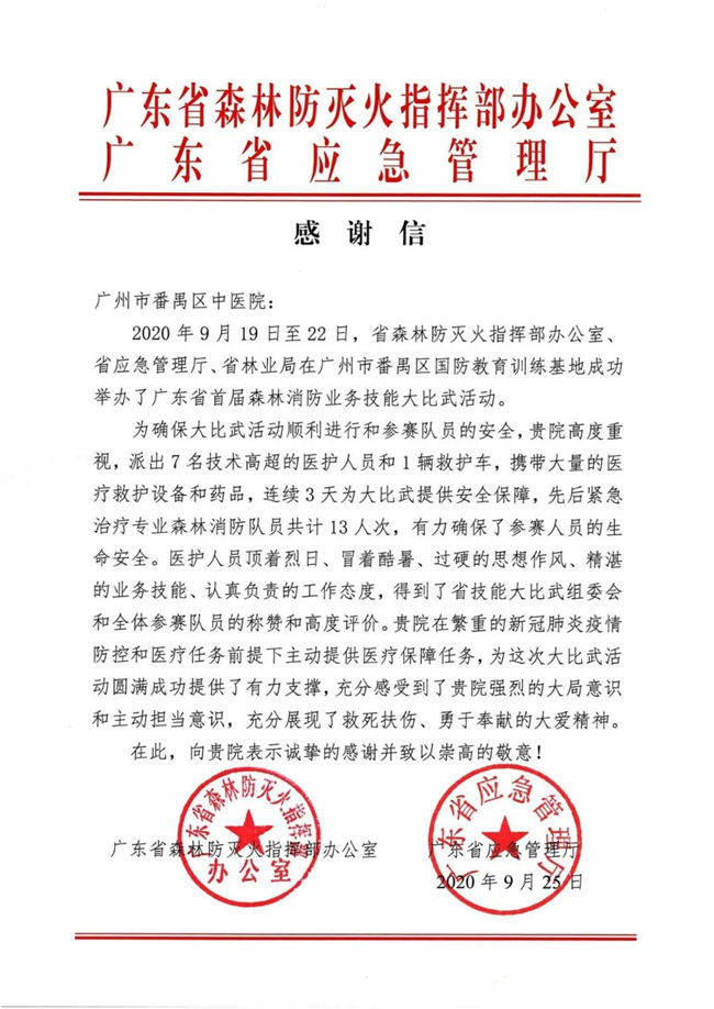 近日,我院收到广东省森林防灭火指挥部办公室、广东省应急管理厅发来的感谢信,对于我院为广东省首届森林消防业务技能大比武活动提供医疗保障工作给予高度肯定与赞扬,诚挚地感谢我院的支持和医护人员的辛勤付出。