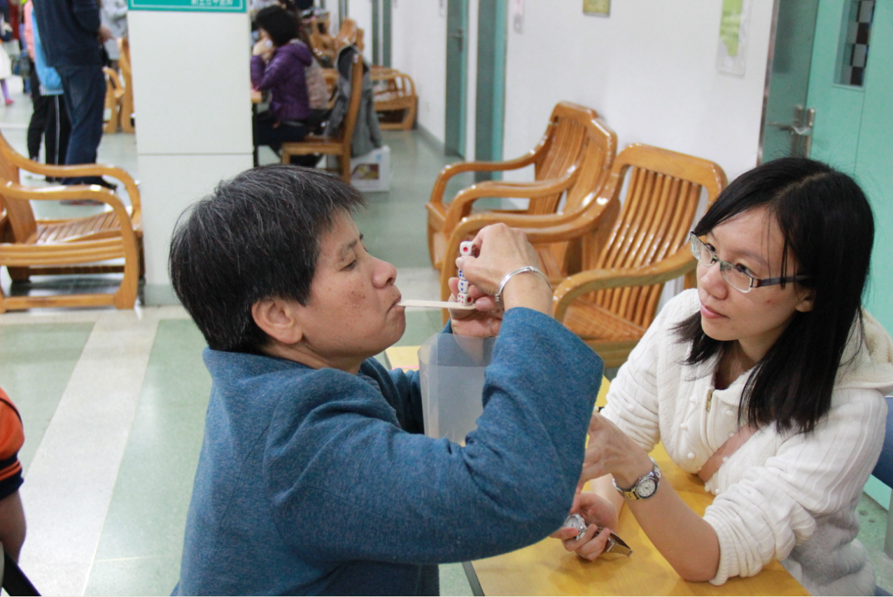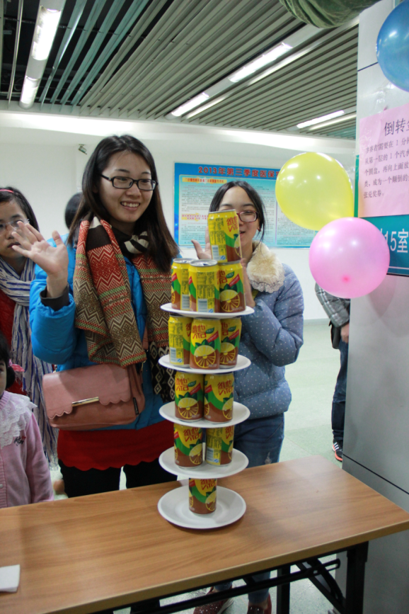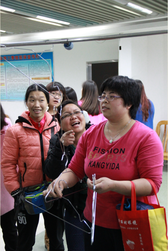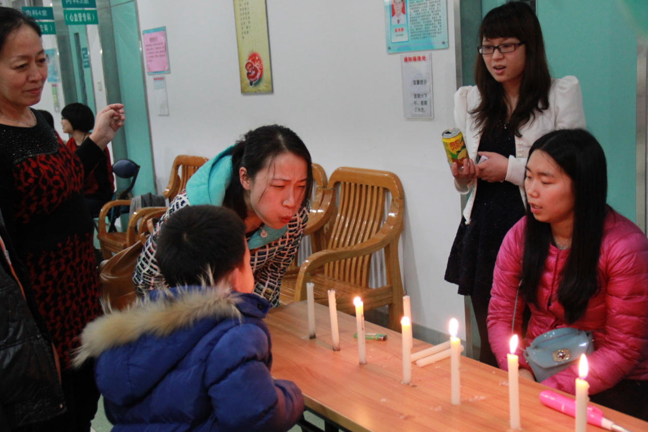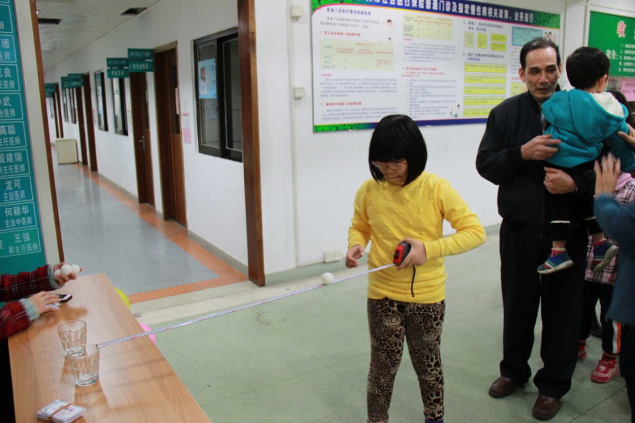 当晚天空虽然下着小雨,但依然挡不住人们参与活动的热情。活动现场,每个游戏前都排满了长长的队伍,有翘首眺望的等待者,蓄势待发的准备者,凝声屏气的参与者……4、5岁的小儿在家长的怀抱中噘着小嘴吹蜡烛,年届60的老者小心翼翼地把骰子放在舌尖的木棍上,笑声、欢呼声、加油声在整个门诊大楼回荡着……