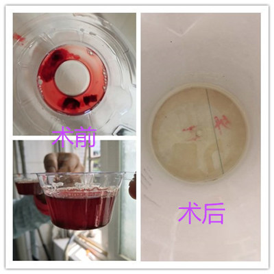 经过完善的术前准备,在广州医科大学附属第二医院微创介入科何明基主任和我院介入科祁家祥主任指导下,介入导管室陈钜深、李振恒两位医生为患者执行手术。术中,发现患者右肾上部多个异常血管团,结合临床和相关检查,考虑为肾多发动脉瘤。向病变供血血管注入聚乙烯醇泡沫栓塞微粒适量及置入弹簧圈6枚,再造影,确认异常血管团消失,手术顺利完成。术中患者没有表示有明显不适。术后第二天,患者血尿基本消失,效果立竿见影。