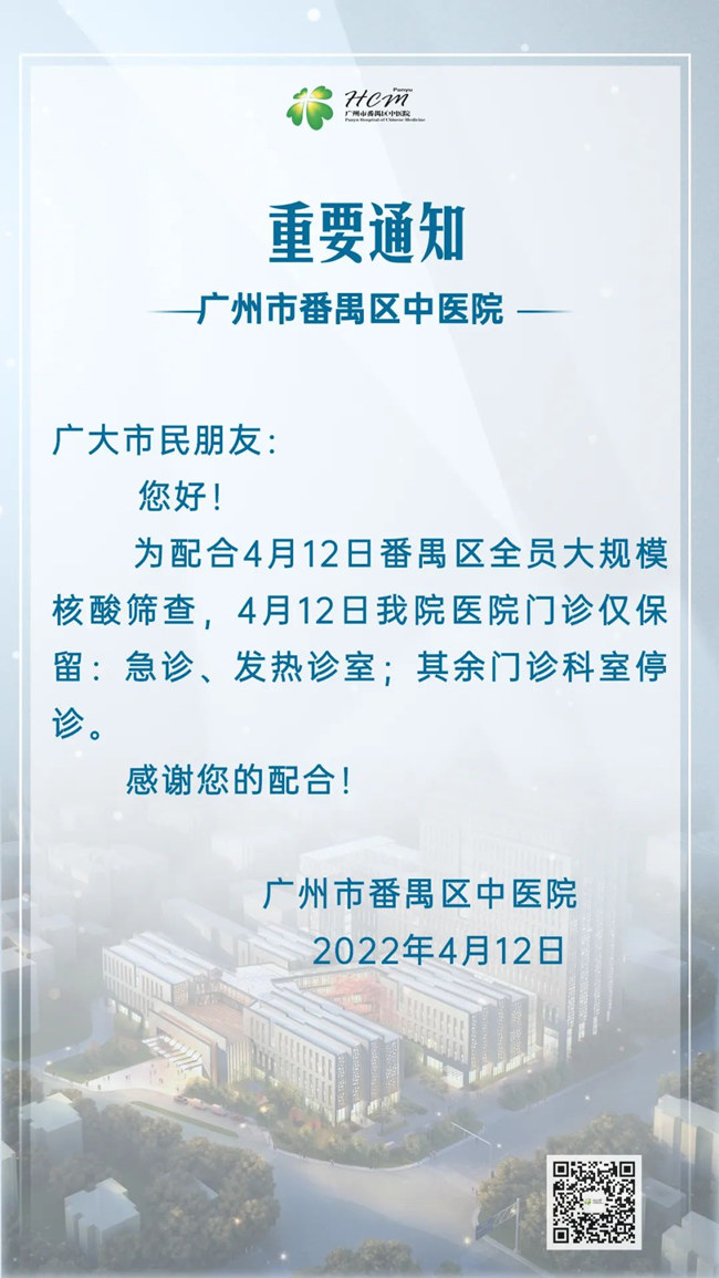 【重要通知】为配合全区全员大规模核酸筛查,番禺区中医院4月12日停诊部分业务!