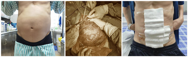 历时一个多小时,患者腹腔内的巨大肿瘤终于被完整切除掉,周围脏器也没有任何损伤,出血量仅100毫升,手术顺利结束。被切除的肿瘤体积为30×25×18立方厘米,有一个人双手环绕那么大,重15斤。