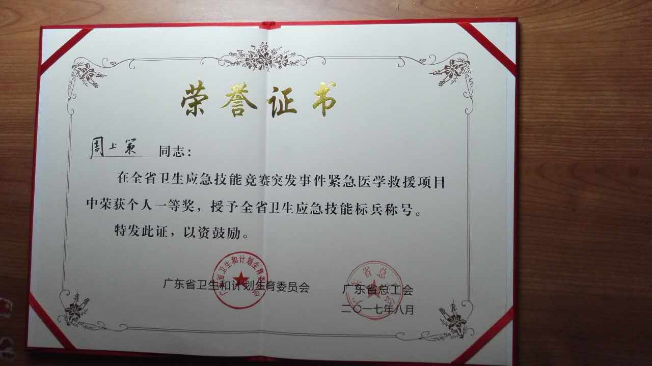 近日,由广东省卫生计生委和广东省总工会主办的“广东省卫生应急技能竞赛暨全国卫生应急技能竞赛广东省选拔赛”在省疾控中心举行。区中医院急诊科主治医师周上策在此次比赛中夺得“突发事件紧急医学救援竞赛组”个人一等奖,并按程序获“广东省五一劳动奖章”。