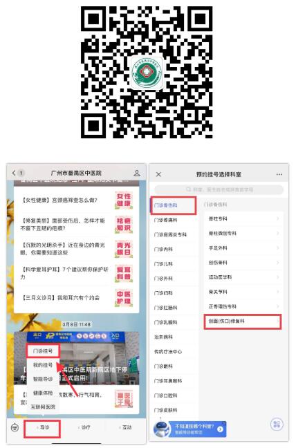 3、挂号流程:关注“广州市番禺区中医院”微信公众号,公众号底部菜单栏点击【导诊】→【门诊挂号】→【门诊骨伤科】→【创面(伤口)修复科】。