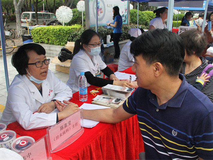 2018年4月25日上午,由番禺区卫计局主办,区疾控中心、区健教中心、桥南街道办承办,各医疗卫生单位协办参与的“全民健康,从预防做起”番禺区2018年世界卫生日暨4.25预防接种宣传周宣传活动在奥园广场举行。我院派出治未病专家及膏方药师为广大群众提供中医“治未病”义诊咨询。