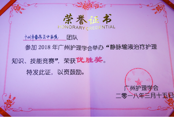 2018年3月15日,由广州市护理学会主办,广州医科大学第一附属医院承办的“2018年广州护理学会静脉输液治疗护理知识、技能(ORA)竞赛”在广州医科大学第一附属医院隆重举行。我院静脉治疗护理小组在此次比赛中荣获优胜奖的好成绩。