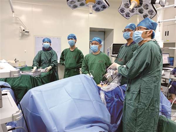 经过充分的术前准备,黄勇带领团队成功为陈女士实施了腹腔镜下直肠经括约肌间切除+区域淋巴结清扫+末段回肠临时性造瘘术。手术全程经腹腔完成,在保证肿瘤安全的基础上,保护了腹部及盆底自主神经,同时最大限度地保护了患者的肛门括约肌功能。术中采用全腹腔镜微创操作使切口及创伤最小化,出血仅约20毫升,几乎实现了“零出血”的微创效果。
