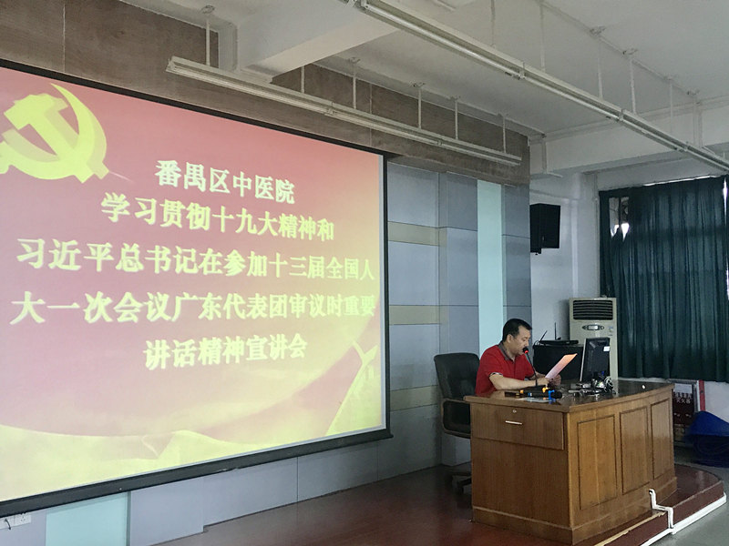 5月11日下午,我院邀请了中共广州市番禺区委宣传部宣讲团成员胡洪涛老师到我院开展学习贯彻宣传党的十九大精神、《习近平谈治国理政》第二卷和习近平总书记在参加十三届全国人大一次会议广东代表团审议时重要讲话精神的宣讲活动。会议由医院党总支书记、院长彭彦慧主持,170多名党员参加了会议。