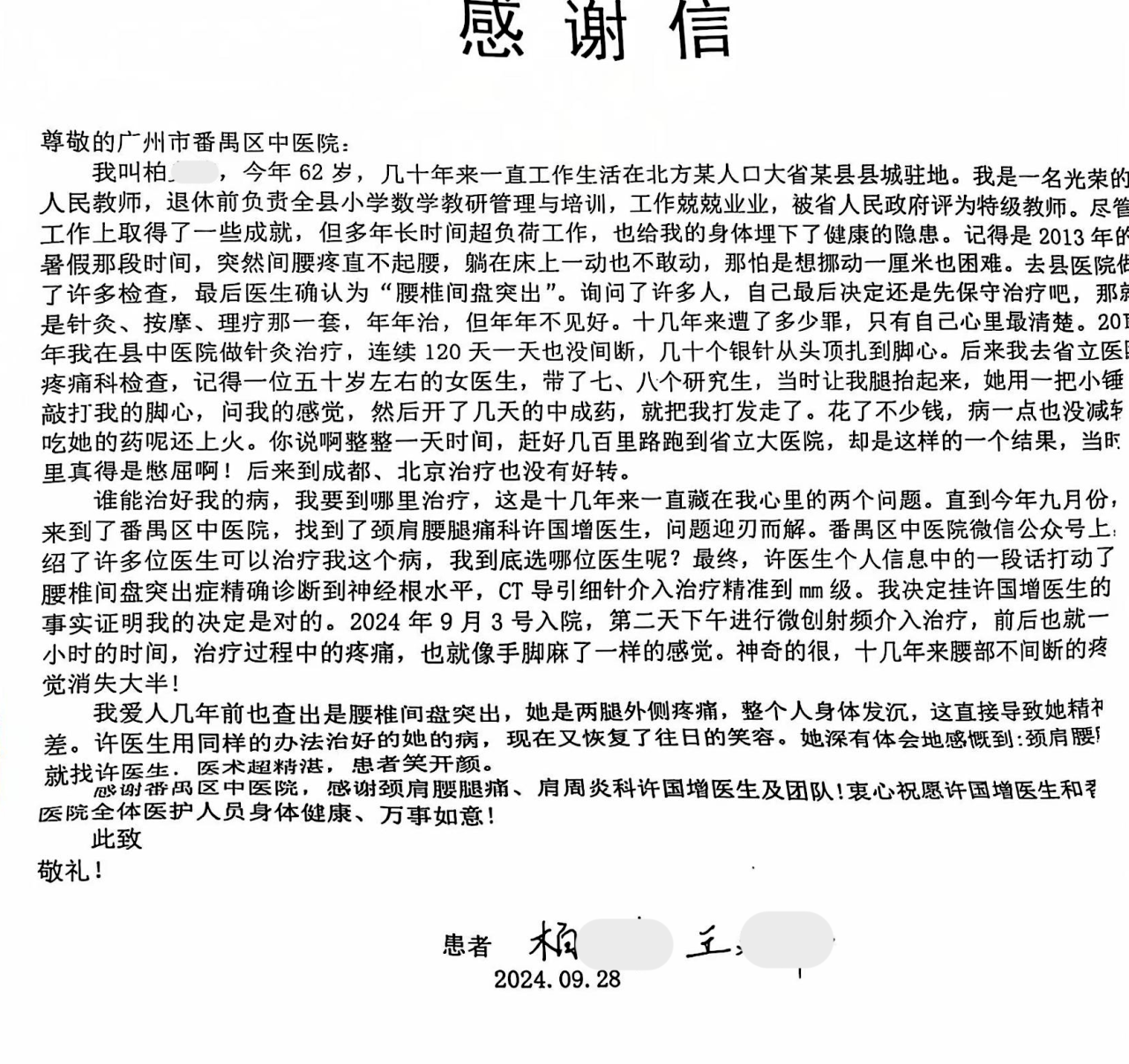“颈肩腰腿痛,就找许医生,医术超精湛,患者笑开颜。”退休特级教师柏老师在给番禺区中医院的感谢信中如此写到。
