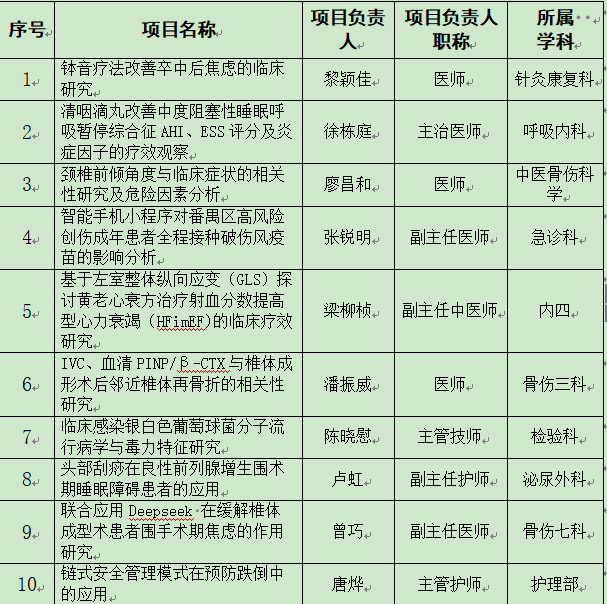 根据《番禺区卫生健康局关于征集2025年番禺区科技计划医疗卫生项目的通知》有关规定,2025年番禺区科技计划一般医疗卫生项目,我院限额推荐11项,实际申报项目为10项。经院领导研究决定,现将2025年番禺区科技计划一般医疗卫生项目的院内推荐项目名单公示如下: