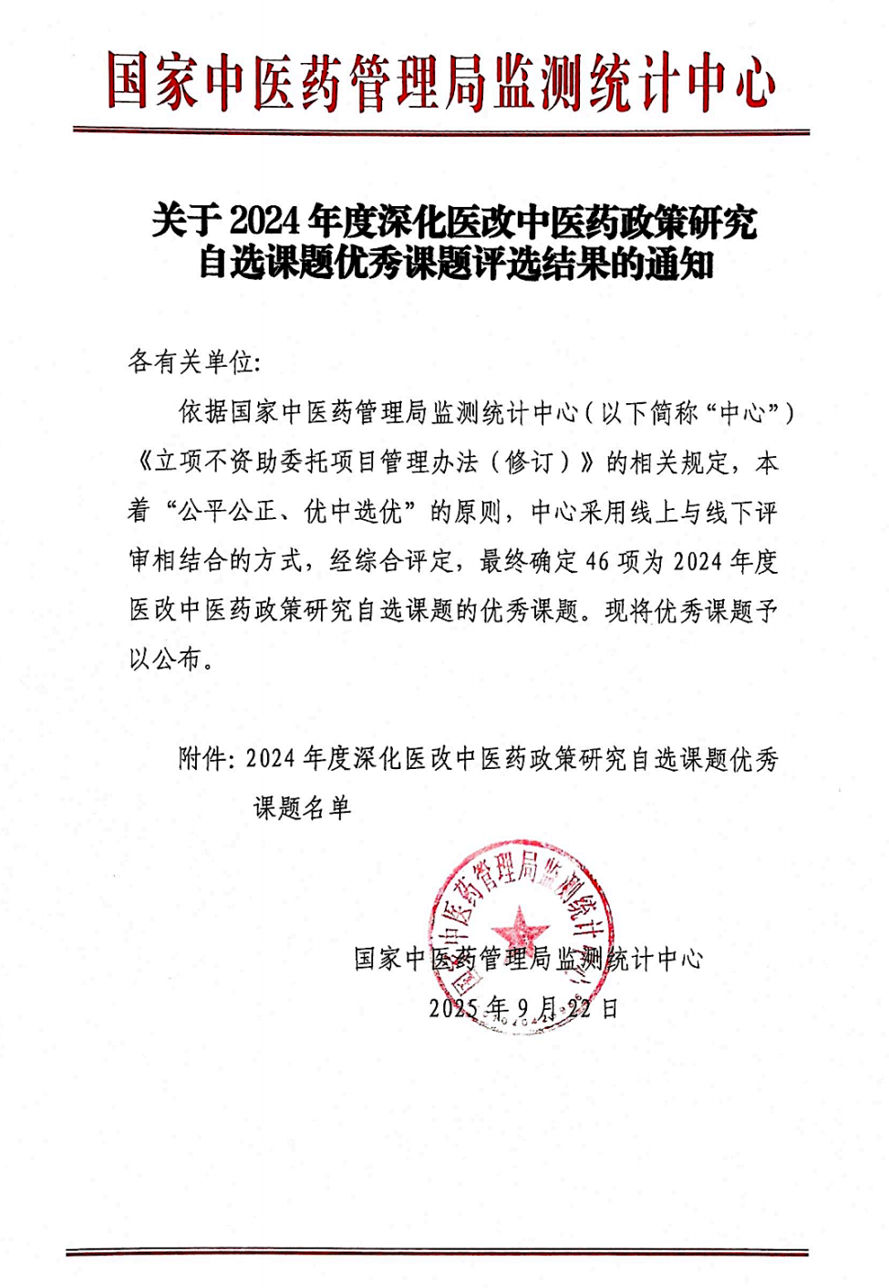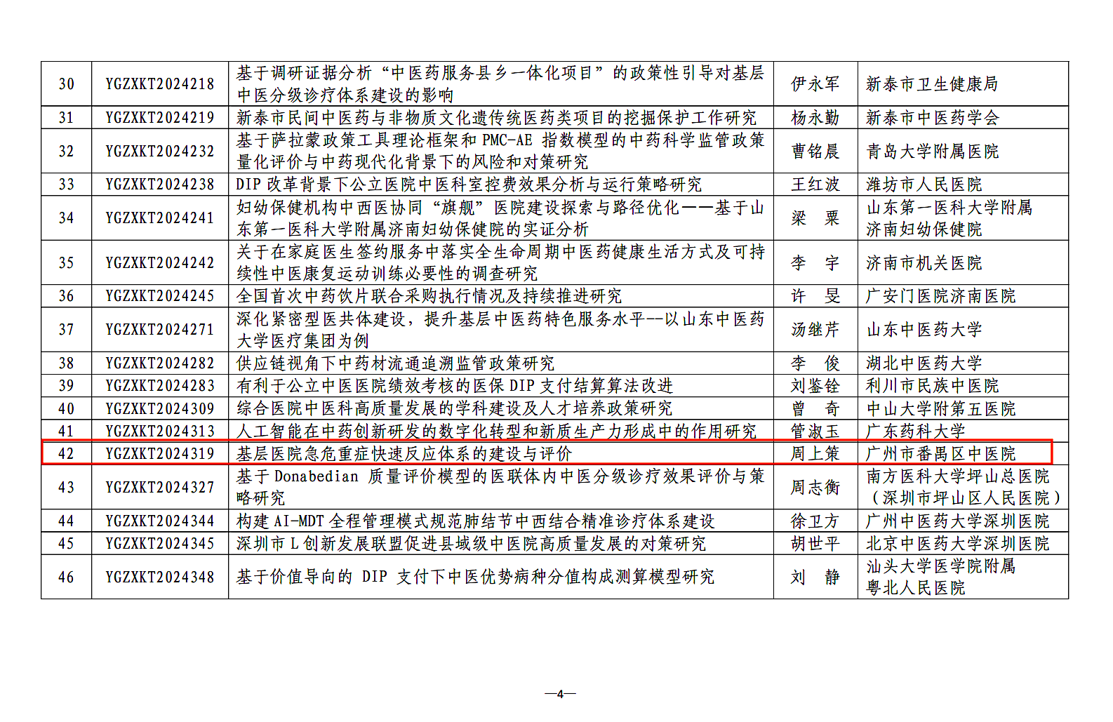 近日,国家中医药管理局监测统计中心公布了2024年度深化医改中医药政策研究自选课题优秀成果,由广州中医药大学番禺医院(番禺区中医院)急危重症快速反应体系(RRS)工作组申报的《基层医院急危重症快速反应体系的建设与评价》(ABCDE-RRS项目)荣获“优秀医改课题”称号。此次全国参评的371项课题中,仅有46项获此殊荣,广东省也仅有7个项目入选。这标志着我院在急危重症救治领域的创新成果获得了国家层面的高度认可。