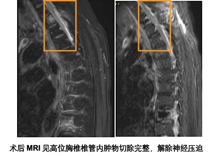 术后病理显示,T2椎体肿物是脊膜瘤,为良性肿瘤,切除后无需放化疗。劳阿姨和家属松了口气。更惊喜的是,她恢复远超预期:术后第一天疼痛缓解,第三天能在助行器辅助下活动,第五天自主下地行走,左下肢痹痛消失。