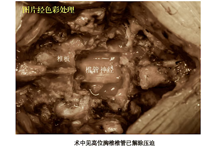 陈晓峰教授团队联合多学科会诊,制定“分步治疗、先解急症”方案:先处理压迫神经的上胸椎椎管狭窄和T2椎体肿物,再择期处理腰椎病变。方案重点抓住关键矛盾,考虑了高龄患者耐受能力,保障手术安全。