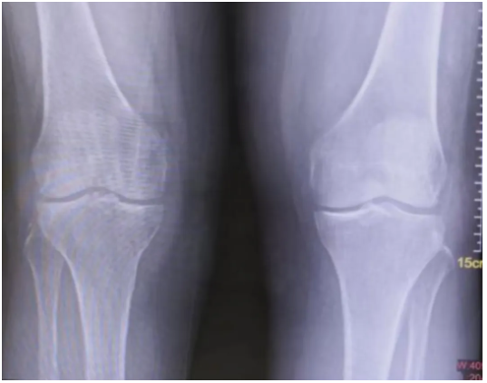 X光检查发现,黄阿姨的双膝关节间隙变窄,提示双膝关节炎,触诊发现双侧大腿外侧和小腿外后侧肌肉硬得像石头。