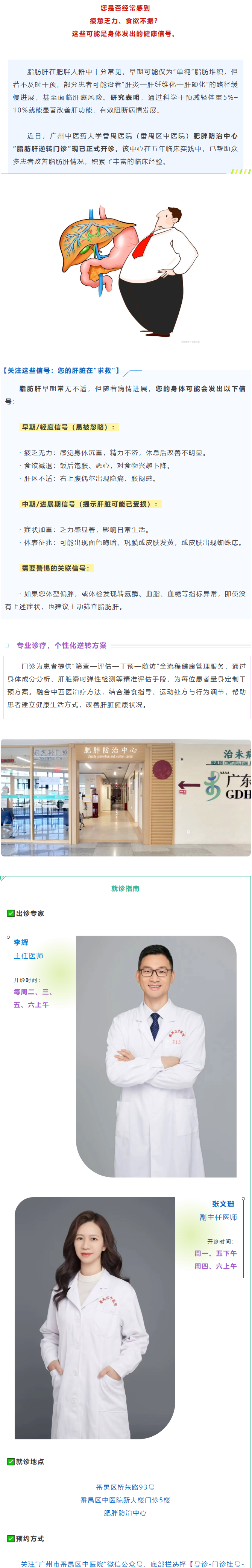 【就医资讯】科学逆转脂肪肝有新途径!广州中医药大学番禺医院肥胖防治中心开设专病门诊