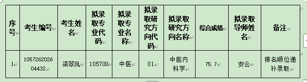 根据我院教学工作和学科建设发展实际需要,经向广州中医药大学申请联培中医专硕专项计划拟增加1名中医专硕名额,依照我院2026年硕士研究生复试录取实施细则,按考生专业复试综合成绩排名顺位拟递补录取1名考生。现予以公布,最终拟录取结果以广州中医药大学研究生院官网公布为准。
